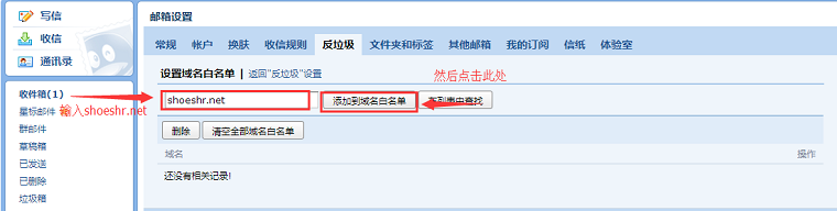 5.在文本框中输入本站如下图的邮件系统邮箱shoeshr.net,然后点击“添加到域名白名单”将邮件系统邮箱加入白名单,确保鞋业人才网邮件系统邮箱发出的邮件不被QQ系统错误过滤掉