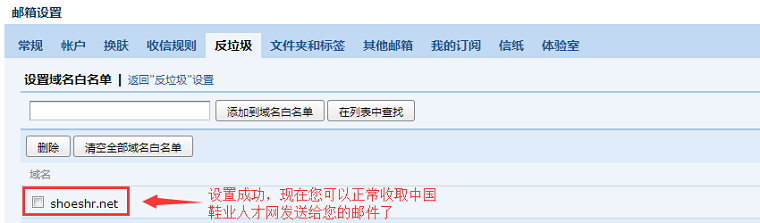 近期有部分客户反映,他们使用的邮箱原来可以正常接收鞋业人才网(ShoesHR.com)邮件系统发送的邮件,但是现在却发现本站发过去的邮件被直接放置到广告邮件文件夹或垃圾邮件文件夹,有时候甚至会出现接收不到的情况,因此有时也请关注一下垃圾邮件文件夹和广告邮件文件夹中的邮件,也许有些重要邮件被邮箱误杀,您也可以在邮箱进行以下设置,即可恢复正常接收鞋业人才网(ShoesHR.com)的邮件。